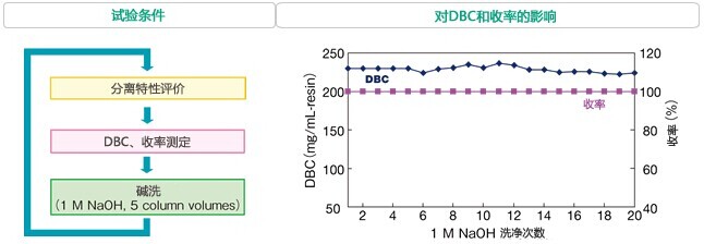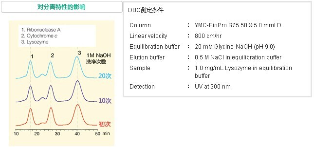 對于蛋白質(zhì)純化用色譜柱的清洗/殺菌常采用堿性溶液進(jìn)行定位清洗的方法(CIP:cleaning in place)。YMC-BioProl離子交換填料因為具有卓越的耐堿性,所以即使使用1M NaOH實施20次的CIP也能維持高DBC和收率,而不會發(fā)生分離特性的改變。