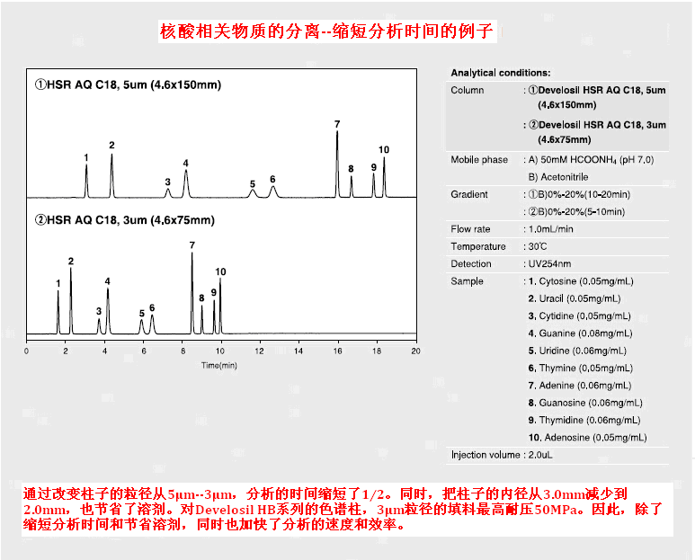 縮短分析時間可以幫助分析者提高工作效率。Develosil系列色譜柱會嚴(yán)格的控制填料的粒徑,所以通過縮小柱填料的粒徑,可以精準(zhǔn)的縮短分析時間。
