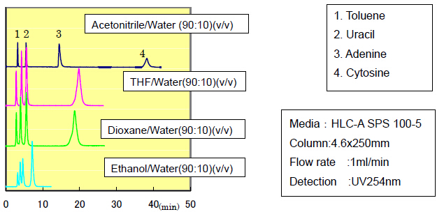乙腈、THF和二氧六環(huán)通常溶解在水中作為流動相使用,而不會產(chǎn)生氫鍵相互作用。在高水相的條件下,洗脫時間變快。雖然反相體系常用于水溶性化合物的分離,但是HLC硅膠更適合用于極性化合物的分離。