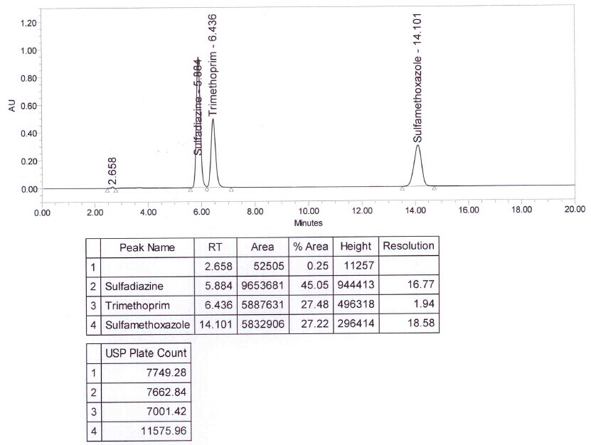 ??? 下圖是用Merck Hibar Purospher STAR LP 柱,使用藥典的方法,對(duì)聯(lián)磺甲氧芐啶片中磺胺甲噁唑、磺胺嘧啶和甲氧芐啶含量進(jìn)行測試的譜圖,請(qǐng)參考。