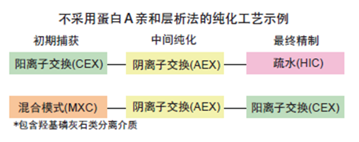 ??? 不采用蛋白A親和層析法的純化工藝可降低工藝成本。可通過結(jié)合使用陽離子交換層析法 ( CEX ) 、陰離子交換 層析法 ( AEX )、疏水相互作用層析法 ( HIC ) 以及混合模式層析法 ( MXC ) 實現(xiàn)對單抗的高純度純化制備。