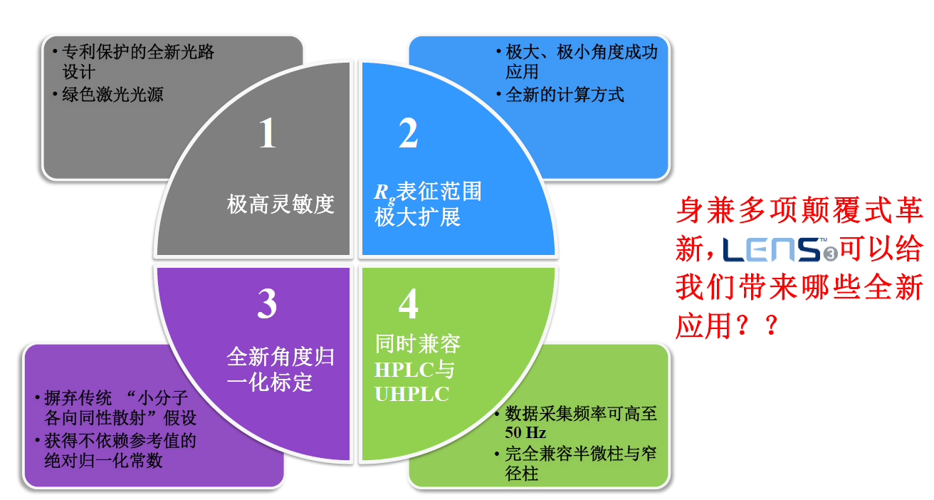 相較于自上世紀(jì)80年固有的光散射技術(shù),東曹推出的LenS3光散射采用全新設(shè)計(jì)概念,完美集成的一個(gè)極小角度(10°LALS),一個(gè)極大角度(170° High Angle Light Scattering, HALS),和一個(gè)直角度(90°RALS),從而達(dá)到: