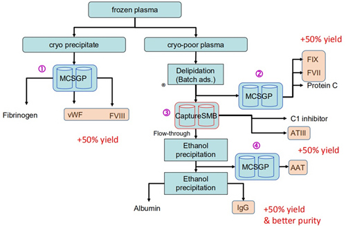 連續(xù)流層析可應(yīng)用于血液制品純化的多個(gè)階段,有效提高純化效率,改善收率和純度,詳見(jiàn)下圖: