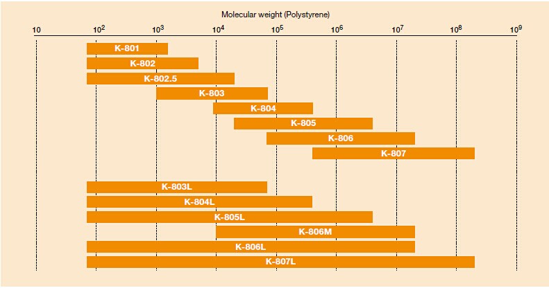 GPC K-805是標(biāo)準(zhǔn)的油溶性SEC色譜柱,適用于從低分子量到高分子量的寬范圍的樣品。流動相是氯仿。