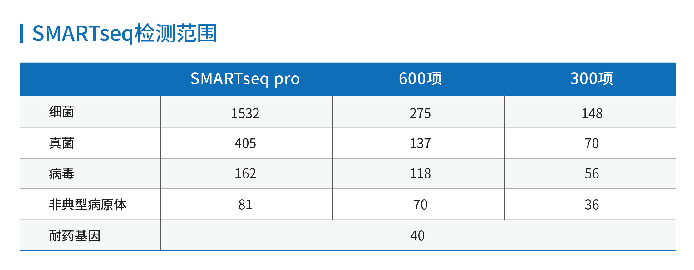 思可愈SMART seqTM Pro/600項(xiàng)/300項(xiàng)多重聯(lián)合基因檢測(cè)產(chǎn)品,對(duì)臨床最常見(jiàn)的600種病原體進(jìn)行靶向捕獲后進(jìn)行高通量測(cè)序,可以對(duì)臨床上約 95-99%的病原體精準(zhǔn)鑒定。并且對(duì)院內(nèi)常見(jiàn)的碳青霉烯腸桿菌、甲氧西林金黃色葡萄球菌等40余種相關(guān)耐藥基因進(jìn)行全長(zhǎng)檢測(cè),一次性實(shí)現(xiàn)常見(jiàn)病原體鑒定和分子耐藥檢測(cè)。
