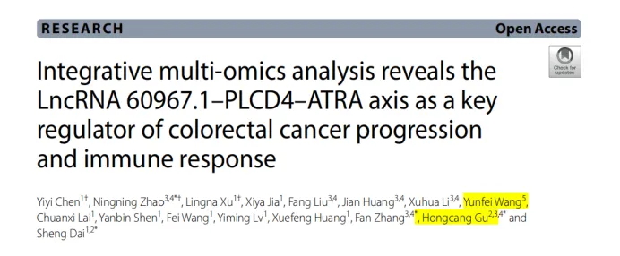2025年6月,圣庭醫療聯合浙江大學醫學院附屬邵逸夫醫院以及中國科學院合肥研究院團隊,在國際頂級腫瘤學期刊 Molecular Cancer(IF=31.3,中科院一區TOP)發表了“Integrative multi-omics analysis reveals the LncRNA 60967.1-PLCD4-ATRA axis as a key regulator of colorectal cancer progression and immune response”。