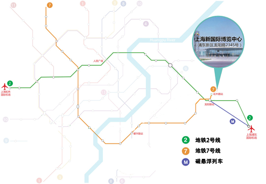 上海新國際博覽中心戰(zhàn)略性地坐落于浦東經(jīng)濟開發(fā)區(qū),距離上海新國際博覽中心600米處有一大型交通樞紐站,即龍陽路站(位于龍陽路上),包括多條路公交線路起點站、軌道交通2號線龍陽路站、軌道交通7號線龍陽路站以及磁懸浮列車終點站。從2號線龍陽路站步行到展館大約需10分鐘;從7號線花木路站步行到展館大約1分鐘。