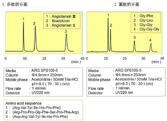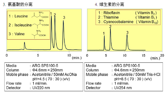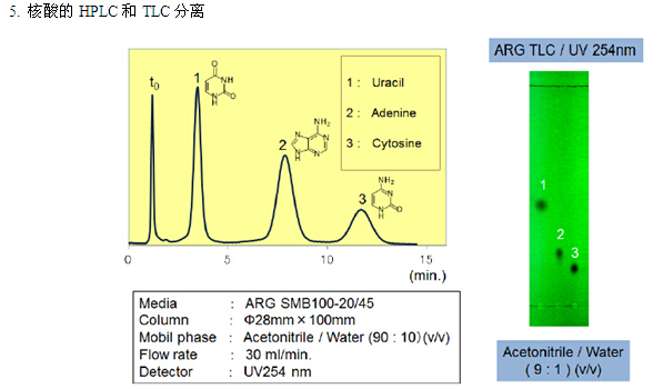親水化合物一般是用反相模式來進行分離,例如使用C18填料。但是,仍然有很多親水的化合物不能用普通的反相模式來分離。近些年來,HILIC模式的填料應(yīng)運而生,特別適合分離親水性化合物(極性大的化合物)。富士硅化學(xué)有限公司開發(fā)了HILIC模式的“ARG硅膠”。ARG硅膠可用于分離氨基酸、多肽、維生素和核酸。不同粒徑的ARG硅膠可分別應(yīng)用于分析以及大規(guī)模的分離純化。