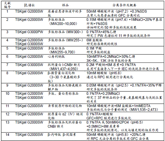 表1所示為TSKgel色譜柱在采用GFC法進(jìn)行多肽分離的相關(guān)文獻(xiàn)及其概要。