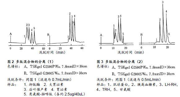 一般情況下,采用GFC法分離多肽所使用的填充劑多為TSKgel的SW硅膠型填料而非TSKgel的PW樹脂型填料。本文中將針對這些填充劑(TSKgel G2000SWXL以及TSKgel G2500PWXL)在多肽分離的應(yīng)用上進(jìn)行探討。