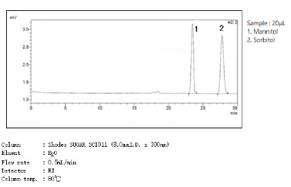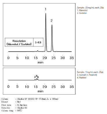 美國(guó)藥典USP規(guī)定,分析甘露醇使用符合L19填料要求的色譜柱,柱子尺寸7.8*300mm,甘露醇與山梨醇的分離度達(dá)到2以上。使用Shodex SUGAR SC1011-7F能完全符合美國(guó)藥典要求。