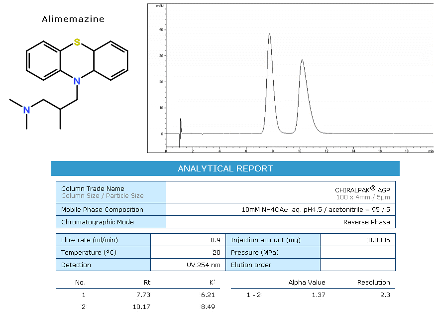 AGP為蛋白質鍵合型手性柱,硅膠表面共價鍵合有α1-酸性糖蛋白。適用于反相系統(tǒng)。 在所有蛋白質鍵合手性柱中,具有最廣泛的適用范圍: 1. 胺類化合物(一級胺,二級胺,三級胺,四級胺類化合物) 2. 酸性化合物(強酸性化合物,弱酸性化合物) 3. 非質子類化合物(酰胺類化合物,酯類化合物,醇類化合物,亞砜類化合物等)
