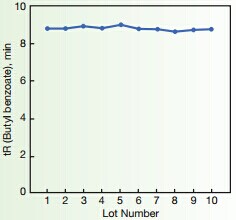 ??? 上圖顯示了疏水性作用的10批生產(chǎn)的批間再現(xiàn)性,這是色譜柱的基本參數(shù),通過對生產(chǎn)過程的嚴(yán)格控制,獲得極穩(wěn)定的批間再現(xiàn)性。其顯示了非常高的批次間重復(fù)性,在分析丁苯時(shí)候,以10批柱子的數(shù)據(jù)為例,保留時(shí)間的標(biāo)準(zhǔn)偏差小于1.5%,這數(shù)據(jù)大大低于普通的C18色譜柱。分析標(biāo)準(zhǔn)物質(zhì)時(shí),每根色譜柱的理論塔板數(shù)可達(dá)18600,壓力為2600psi
