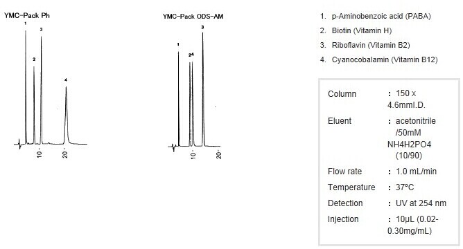 (不同于ODS選擇性的色譜柱) YMC-Pack Ph 是一款具有苯基官能團(tuán)由來(lái)的π電子的色譜柱。對(duì)于諸如芳香族化合物的分離,由于除了疏水性相互作用以外,還有固定相和溶質(zhì)之間π-π電子間相互作用的幫助,因此顯示出不同于包含ODS在內(nèi)的烷基硅膠基質(zhì)固定相的分離特性。