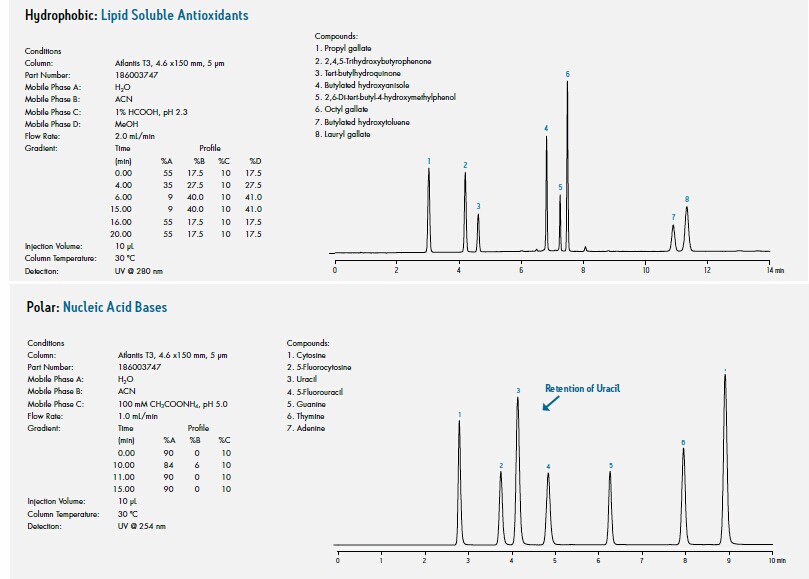 在對于極性化合物的反相HPLC保留與分離方面,Atlantis T3為極性化合物保留設立了行業(yè)標準。Atlantis T3色譜柱是通用的、硅膠反相C18柱,它不僅能保留和分離水溶性的極性小分子有機化合物,而且還為這項優(yōu)異能力提供了更寬的pH操作范圍。對于反相應用,要開發(fā)極性(和非極性)化合物的保留分離方法時,Atlantis T3應該作為第一選擇。